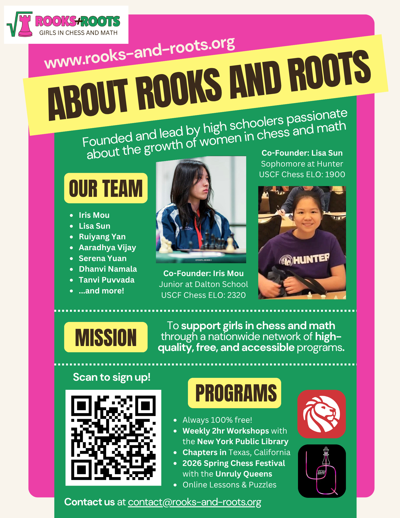 Hi, I’m Iris! I’m a junior in the Class of ’27 at the Dalton School, and I’m a National Master and a Woman Grandmaster in chess. Since Kindergarten, I’ve consistently ranked among the top 2-3 girls in the U.S. for my age, and I’m a 6x KCF All-Girls National Chess Champion. I’ve always been passionate about encouraging more girls to get involved in chess. I’m also deeply involved in math through competitions, school, and extracurriculars, and I’ve seen firsthand how underrepresented girls are in both chess and math. That’s why I co-founded Rooks and Roots: to support and inspire young girls to explore and grow in these fields. Outside of chess and math, I love Robotics, 3D modeling and game design!